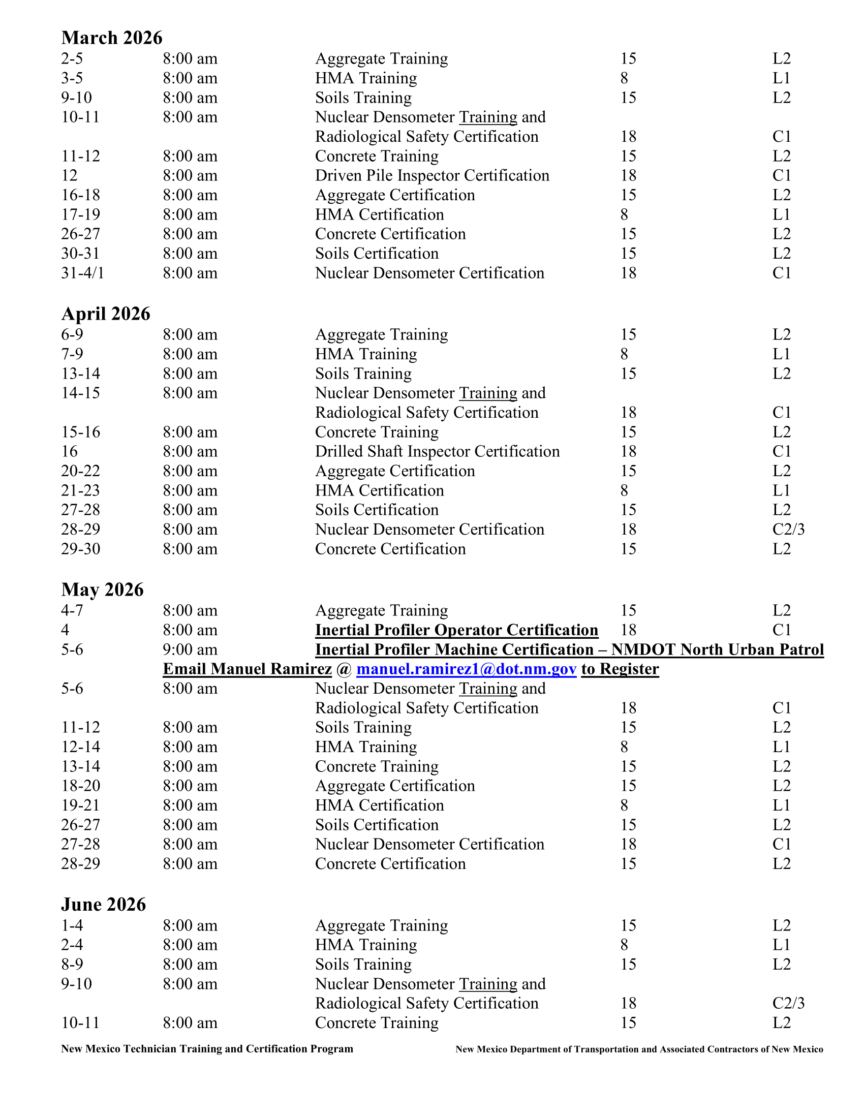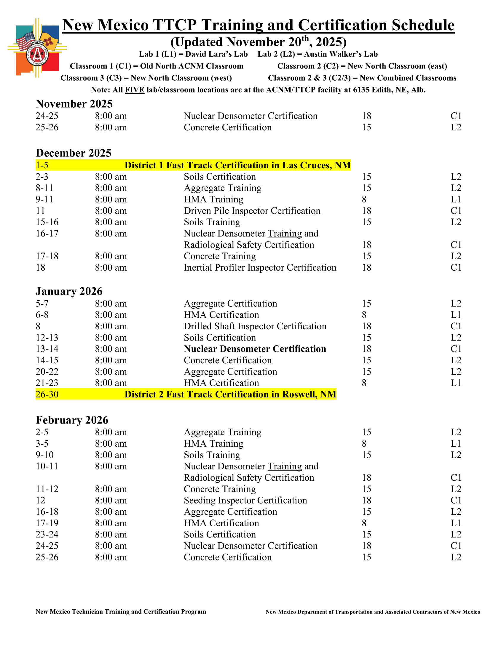 The New Mexico Department of Transportation (NMDOT) and Associated Contractors of New Mexico (ACNM) Technician Training and Certification Program (TTCP) is an organization dedicated to improving the quality and continuity of highway materials sampling and testing. One means of accomplishing this is by ensuring that individuals have demonstrated abilities to engage in quality control or quality assurance activities in transportation construction work that is under the jurisdiction of NMDOT, and those individuals have successfully completed the TTCP. This program is prescribed to meet, in part, the requirements of 23 Code of Federal Regulations 637, Subpart B – Quality Assurance Procedures for Construction as mandated by the Federal Highway Administration (FHWA), effective June 29, 2000.
